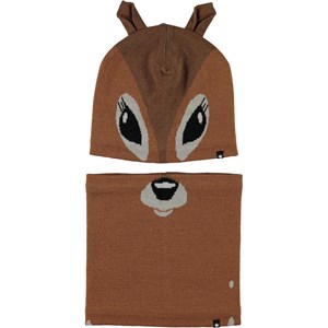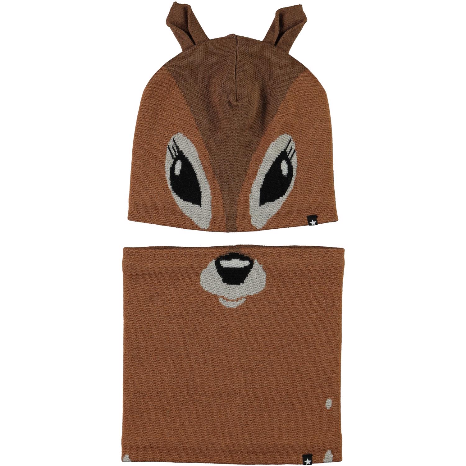 Brun hue og halsrør i uldmix med motiv af et rådyr, som er fordelt på både huen og halsrøret.