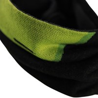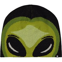 Sort hue og halsrør i uldblanding med alienmotiv, som er fordelt på både huen og halsrøret.
