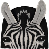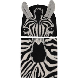 Sort/hvid hue og halsrør i uldblanding med zebramotiv, som er fordelt på både huen og halsrøret.