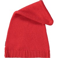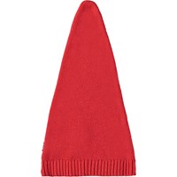 Rød bomuld/uld nissehue med ribkant og spids form.