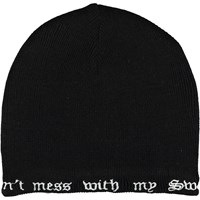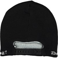Sort hue i uldmix med skrift langs kanten, blødt fleecefor og justerbar lukning bagpå.