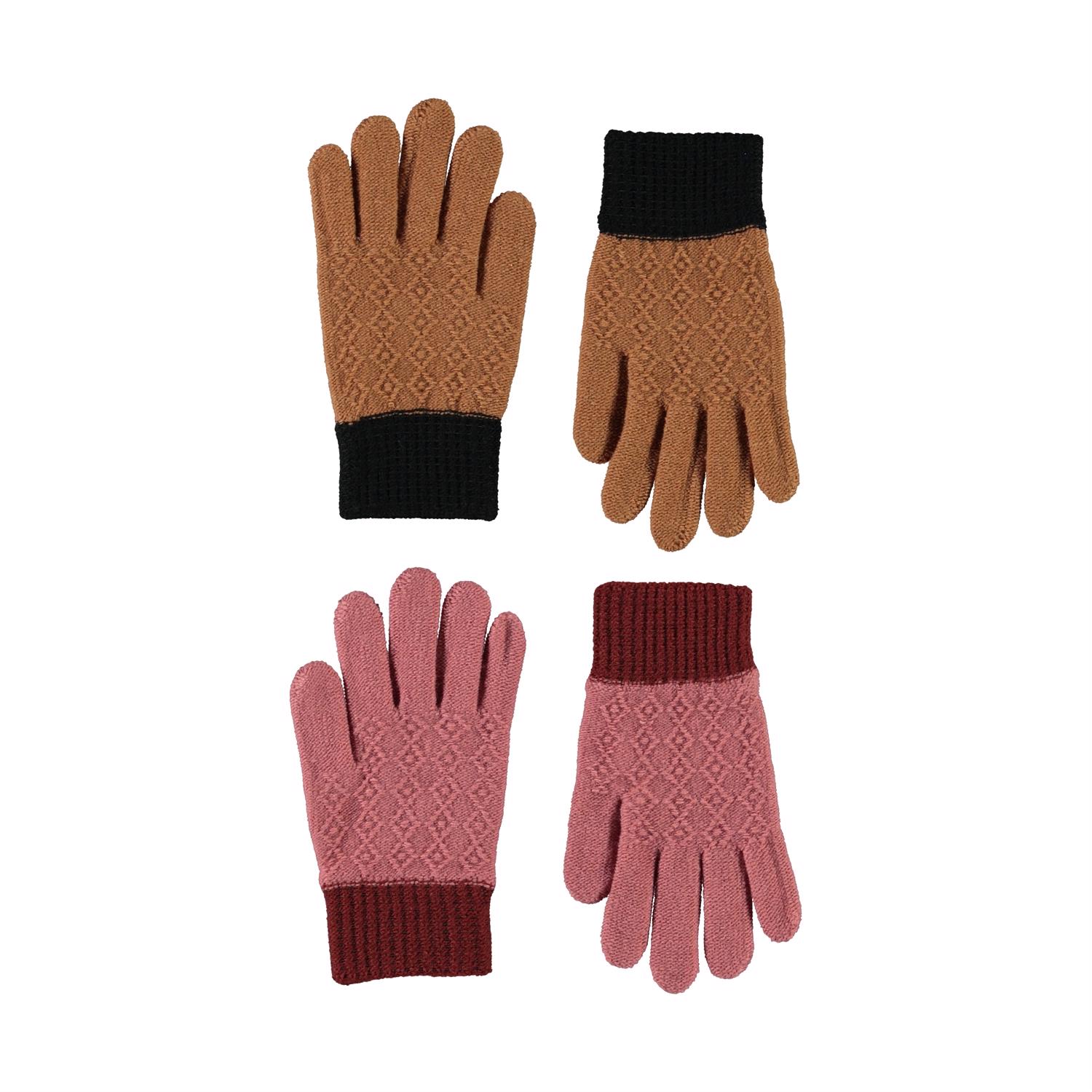 To par strik handsker med fint strik mønster på oversiden af hånden. Det ene par er i lysebrun, mens det andet er i rosa.