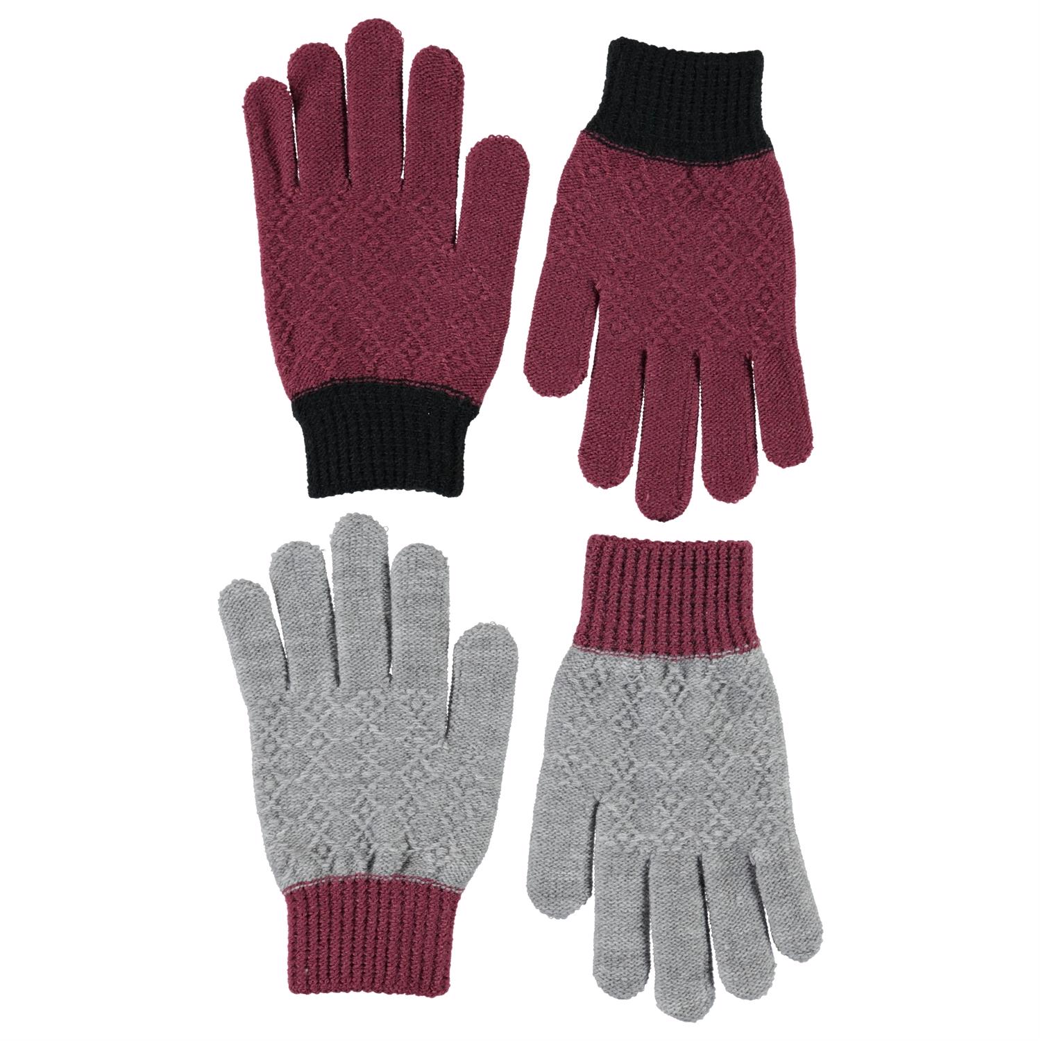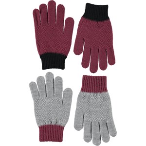 To par strikkede handsker. Det ene par er mørke rosa og sorte og det andet par er grå og mørke rosa.
