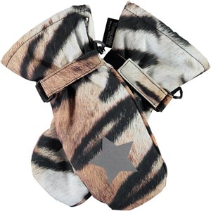 Vandtætte og åndbare luffer med 3M™ Thinsulate™ isolering. Lufferne er i tiger print og har en stjernerefleks på forsiden, samt elastik og justerbar velcro ved håndleddet. Dette produkt har en vandafvisende PFC-fri imprægnering (indeholder f.eks. ikke PFOS, PFOA og lignende). Vandsøjletryk: 10.000 mm. Åndbarhed: 8.000 g/m2/24t.