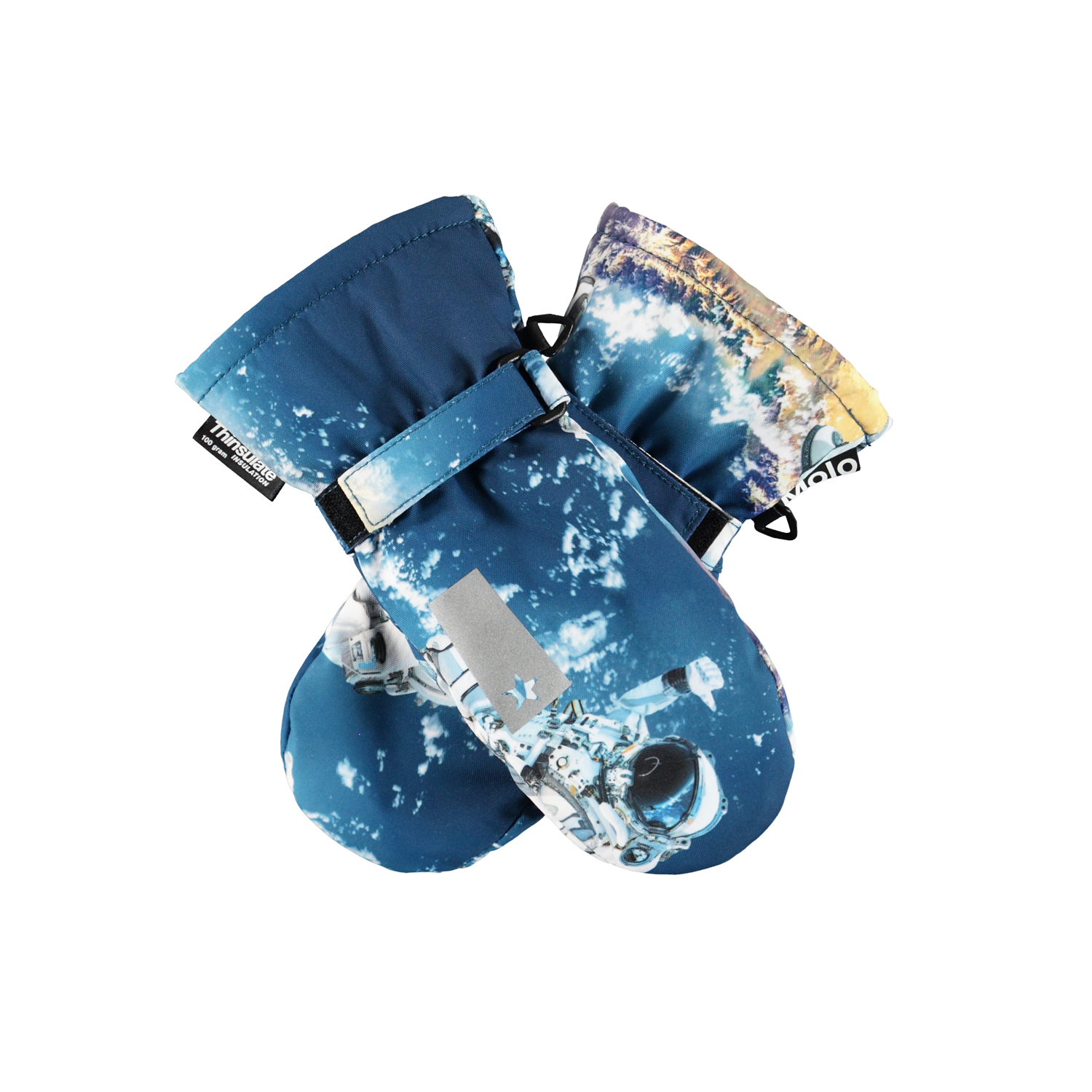 Vandtætte og åndbare luffer med 3M™ Thinsulate™ isolering. Lufferne er i blå med print af astronauter og har en Molo refleks på forsiden, samt elastik og justerbar velcro ved håndleddet. Ydermaterialet er fremstillet af 45% recycled polyester, 3M™ Thinsulate™ foret er fremstillet af 78% recycled polyester og inderstoffet af 100% recycled polyester. Handskerne har en vandafvisende PFC-fri imprægnering (indeholder f.eks. ikke PFOS, PFOA og lignende). Vandsøjletryk: 10.000 mm. Åndbarhed: 8.000 g/m2/24t.