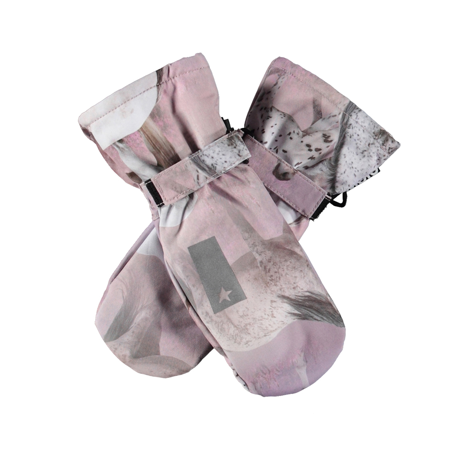 Lilla, vandtætte og åndbare luffer med hesteprint og 3M™ Thinsulate™ isolering. Lufferne har en refleks på forsiden, samt elastik og justerbar velcro ved håndleddet.