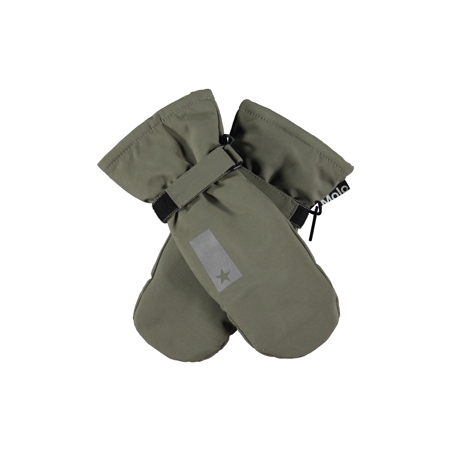 Grønne vinterhandsker til de kolde dage. På indersiden af handsken og ved tommelfingeren er der sorte gummibelægninger, der giver en god gribehåndflade. Handskerne egner sig godt til alt slags vejr og er perfekte både til hverdagen eller skiferien. Derudover matcher handskerne med Molo’s overtøj i farver og print.