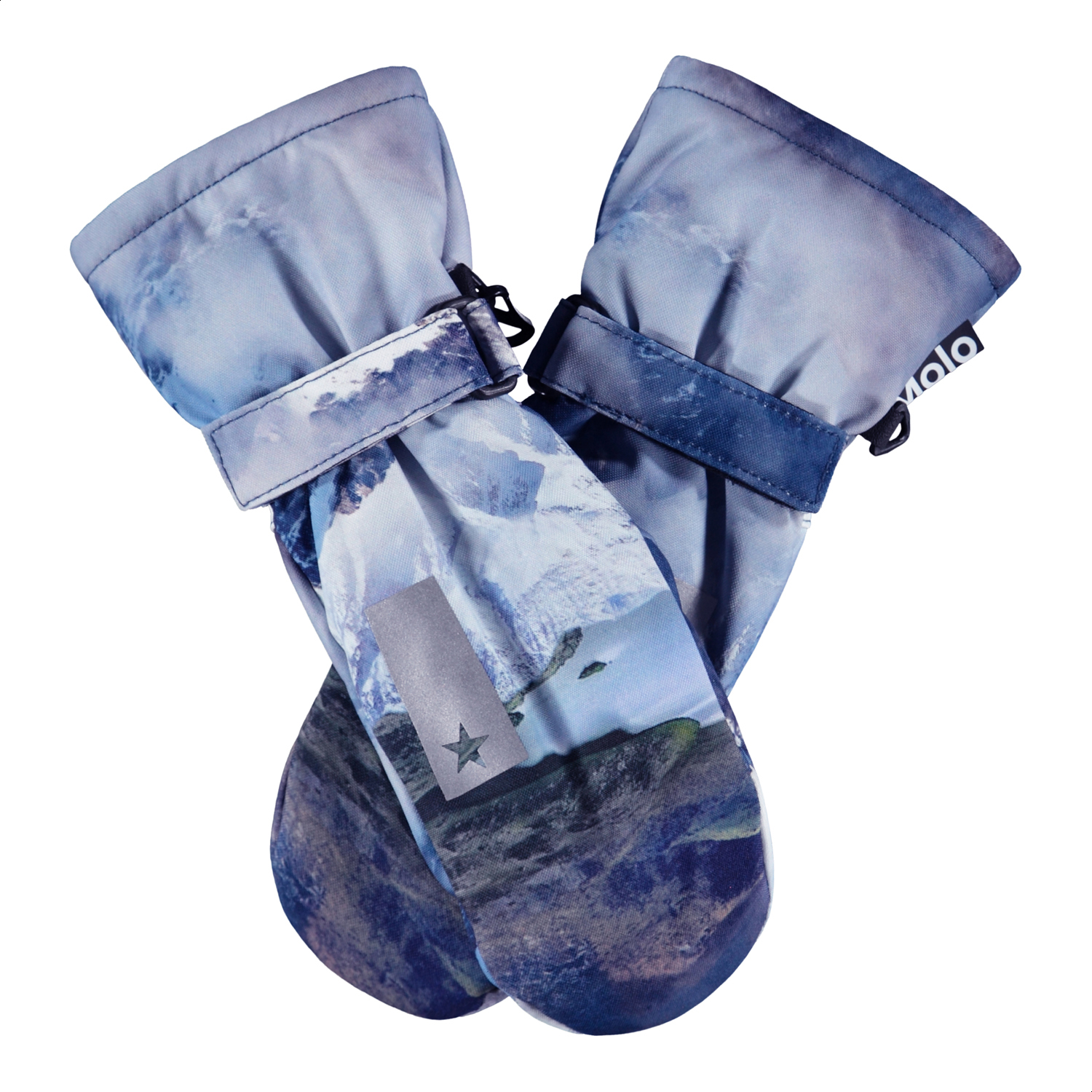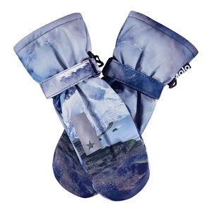 Blå vandtætte og åndbare luffer med bjergprint, fleecefoer og 3M™ Thinsulate™ isolering. Lufferne har en refleks på forsiden, samt elastik og justerbar velcro ved håndleddet.