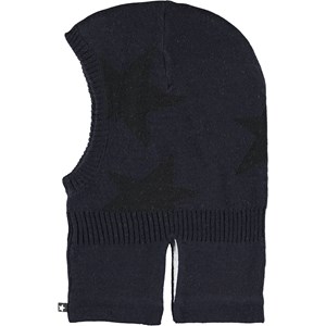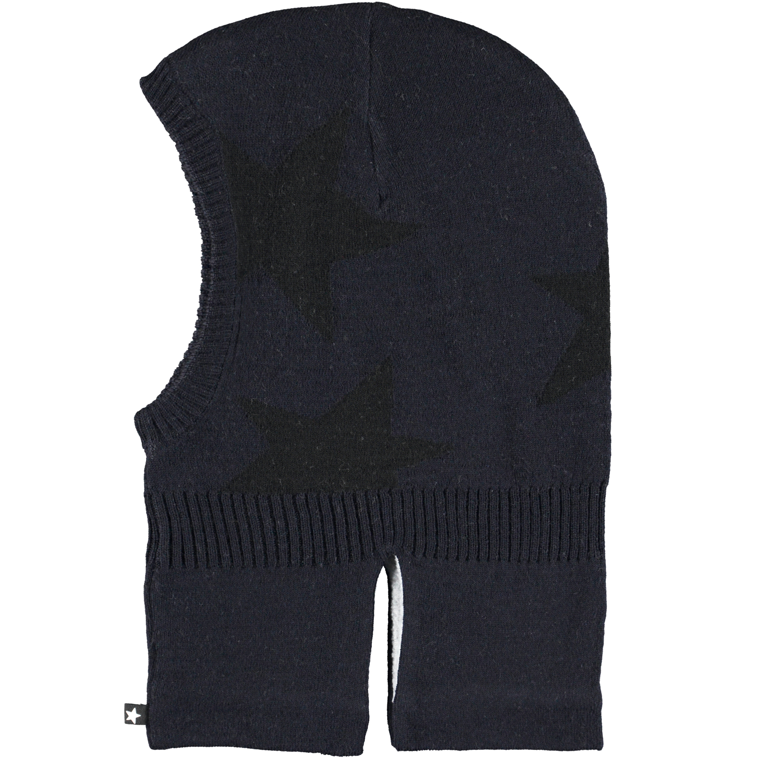 Mørkeblå elefanthue i en blød uldmix med indstrikkede stjerner, blødt fleecefor indvendigt samt indsnit ved halsen, så huen smyger sig bedre over bryst og skuldre.