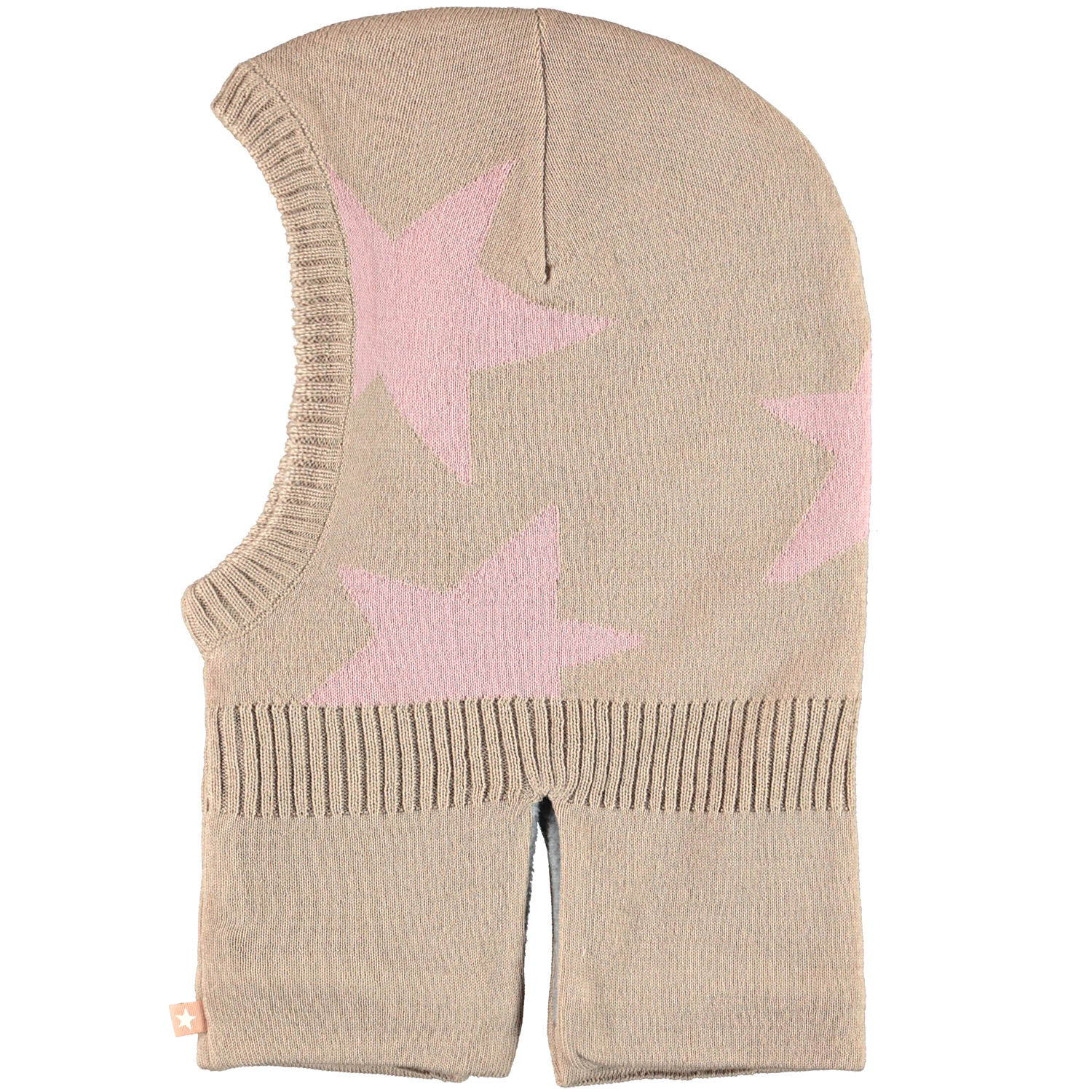 Beige elefanthue i en blød uldmix med indstrikkede rosa stjerner, blødt fleecefor indvendigt samt indsnit ved halsen, så huen smyger sig bedre over bryst og skuldre.