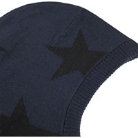 Mørkeblå elefanthue med sorte stjernemønster. Huen har indsnit ved halsen, der sikrer, at den sidder til over bryst og skuldre. Fremstillet i en blød uldblanding og foret med blødt fleecefor.