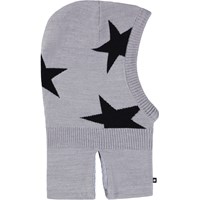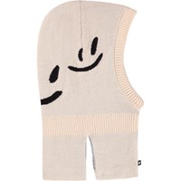 Cremefarvet elefanthue med sorte smilende ansigter. Huen har indsnit ved halsen, der sikrer, at den sidder til over bryst og skuldre. Fremstillet i en blød uldblanding og foret med blødt fleecefor.