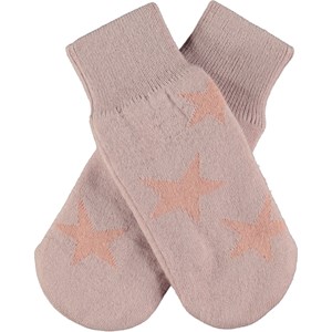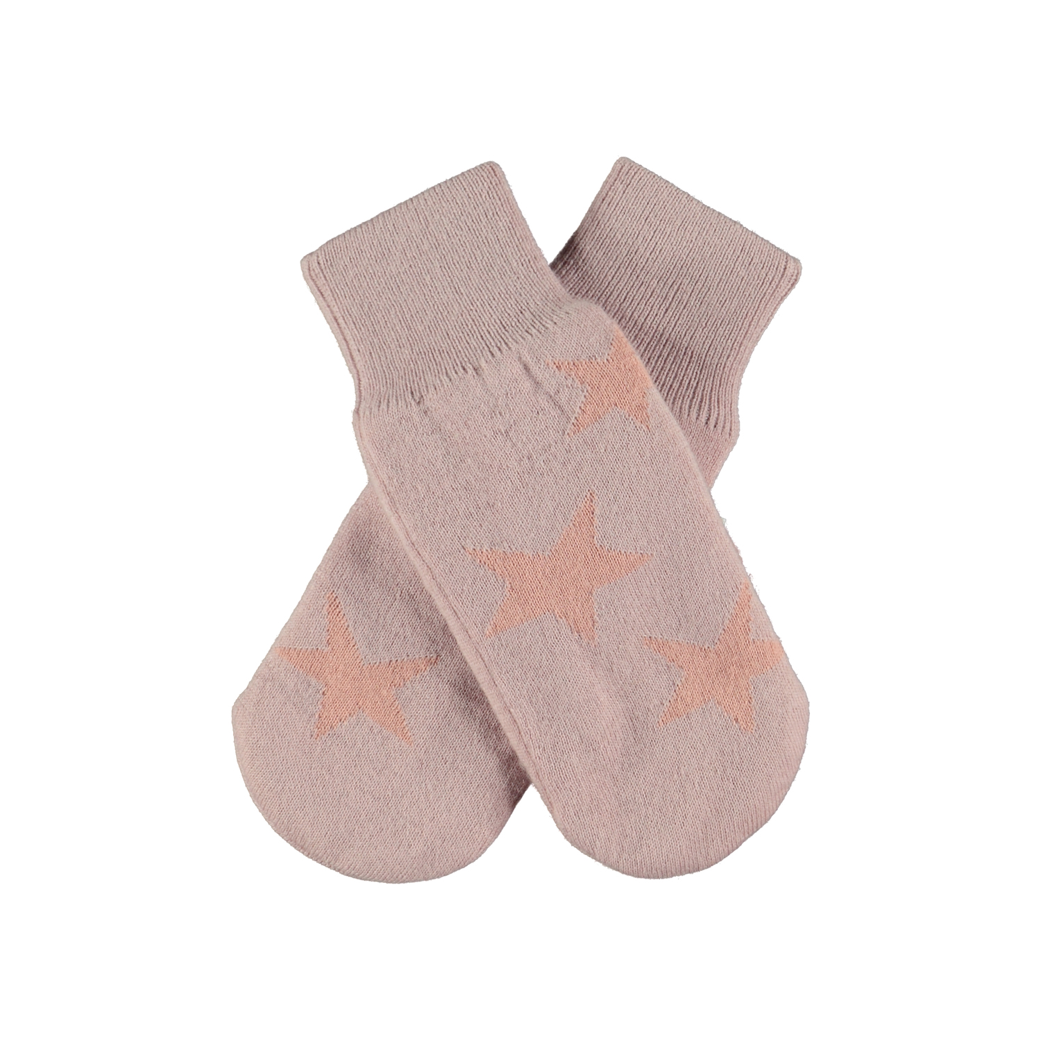Strikvanter i lyserød med indstrikkede stjerner. Handskerne er fremstillet i en blød uldblanding.
