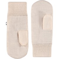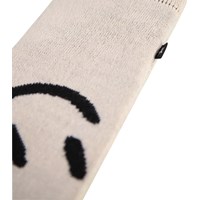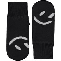Råhvide strikluffer med sort smilende ansigt. Handskerne er fremstillet i en blød uldblanding.