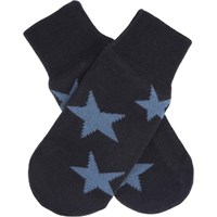 Råhvide strikluffer med brunt stjernemønster. Handskerne er fremstillet i en blød uldblanding.