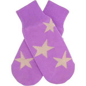 Lilla strikluffer med råhvidt stjernemønster. Handskerne er fremstillet i en blød uldblanding.