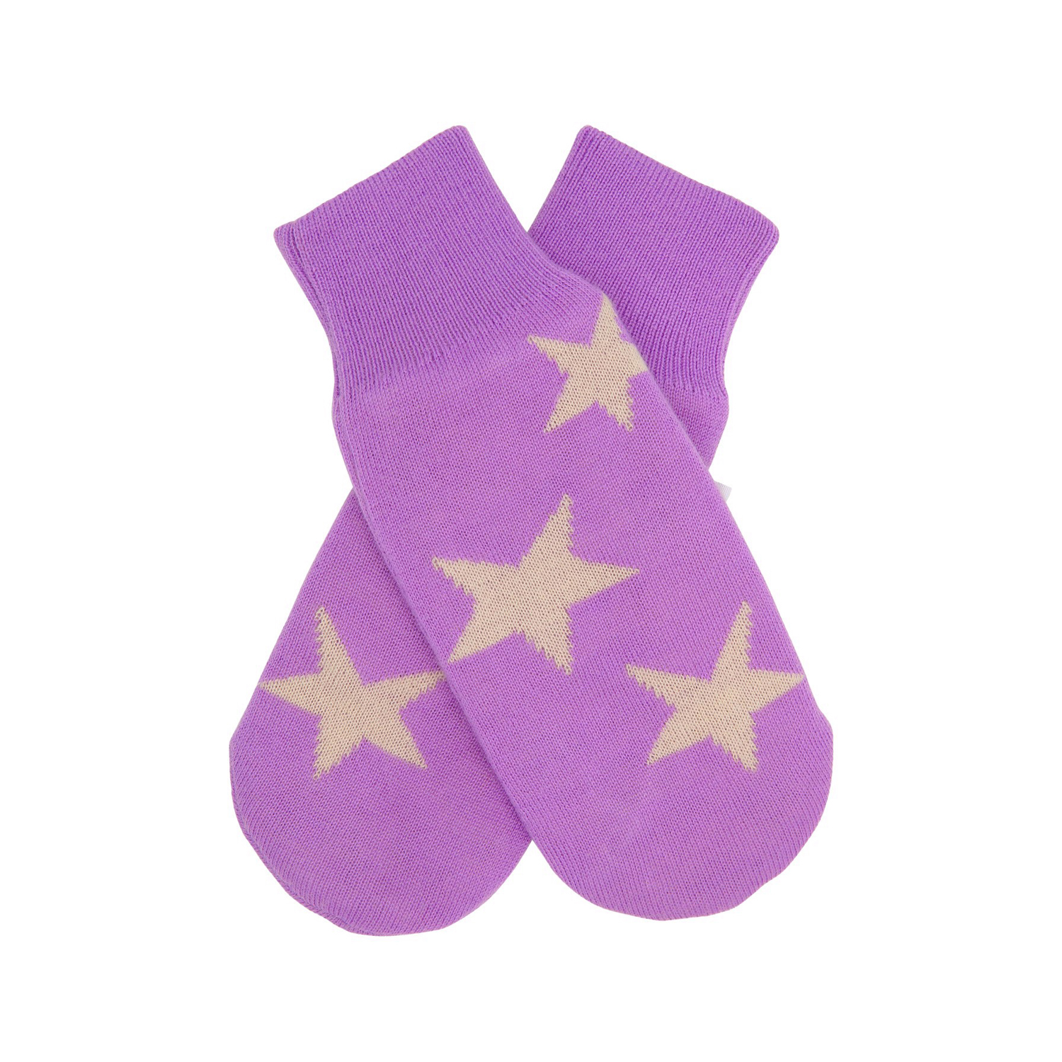 Lilla strikluffer med råhvidt stjernemønster. Handskerne er fremstillet i en blød uldblanding.