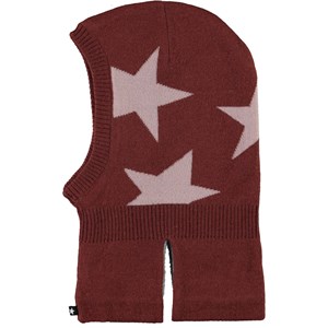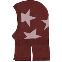 Mørkerød elefanthue i en blød uldmix med indstrikkede stjerner, blødt fleecefor indvendigt samt indsnit ved halsen, så huen smyger sig bedre over bryst og skuldre.