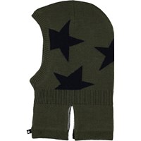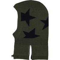 Grøn elefanthue i en blød uldmix med indstrikkede stjerner, blødt fleecefor indvendigt samt indsnit ved halsen, så huen smyger sig bedre over bryst og skuldre.