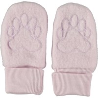 Lilla babyluffer i blød fleece-kvalitet af 100% merinould. Lufferne har tætsluttende ribkanter med opsmøg ved håndleddet og et sødt, broderet potemotiv i håndfladen.