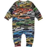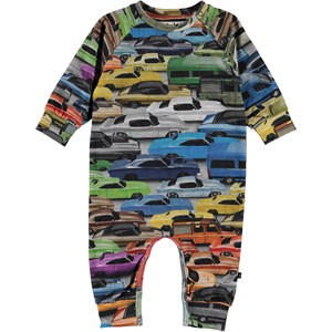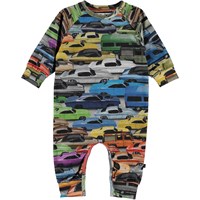 Fleming er en baby body med lange ærmer med all-over print af farverige biler. Bodyen har raglan ærmer og trykknapper på skrå ved halsen og mellem benene, der gør det let, at få bodyen af og på.