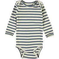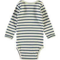 Faros er en langærmet hvid baby body med smalle grå, blå og gule striber. Faros har trykknap i kraven og mellem benene, som gør det nemt at få bodyen af og på. Certificeret af Ecocert Greenlife, certifikationsnr. 197496.