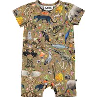 Felton er en lysebrun dragt med et fantastisk og detaljerigt print af surrealistiske dyr og planter. Dragten har korte ærmer og ben. Trykknapper ved hals og mellem ben gør det let at få dragten af og på. Certificeret af Ecocert Greenlife, certifikationsnummer 197496.