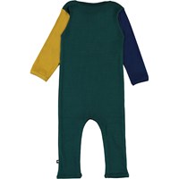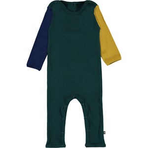 Fenez er en rib baby body i color-block i grøn med et blåt og gult ærme. Trykknapper ved hals og ben gør det let at få bodyen af og på.