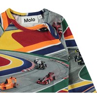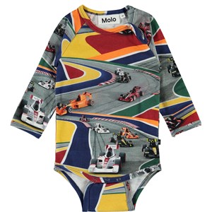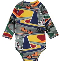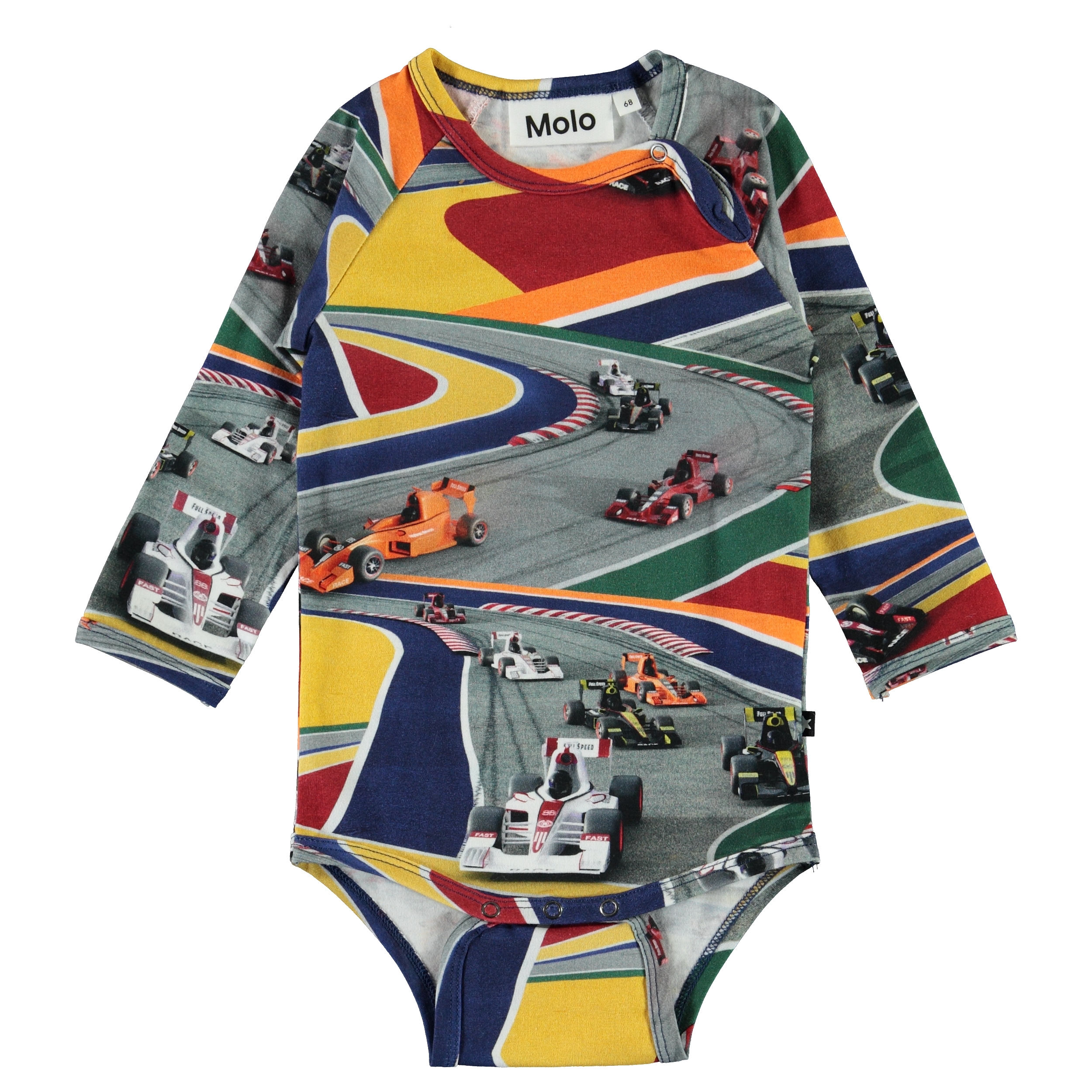 Field er en langærmet baby body med all-over print af farverige racerbiler. Trykknapper ved hals og mellem ben gør det let, at få bodyen af og på.