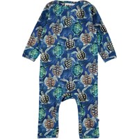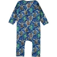 Fleming er en babydragt med lange ærmer og ben. Dragten er i blå med print af skildpadder. Trykknapper ved hals og mellem ben gør det let, at få bodyen af og på. Certificeret af Ecocert Greenlife, certifikationsnr. 197496.