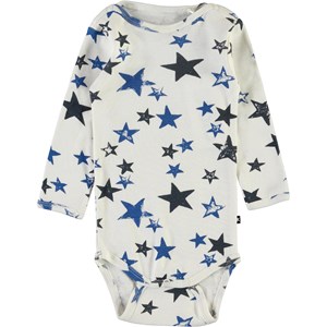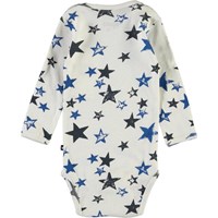 Foss er en langærmet baby body i hvid med blå og sorte stjerner. Trykknapper ved hals og mellem ben, gør det let at få bodyen af og på. Certificeret af Ecocert Greenlife, certifikationsnr. 197496.