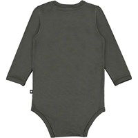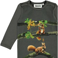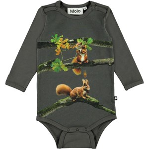 Foss er en langærmet baby body i grøn med print af egern, som samler på nødder. Trykknapper ved hals og mellem ben, gør det let at få bodyen af og på.