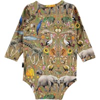 Foss er en lysebrun baby body med et fantastisk og detaljerigt print af surrealistiske dyr og planter. Kombiner med matchende bukser. Foss har trykknap i kraven og mellem benene, som gør det nemt at få bodyen af og på. Certificeret af Ecocert Greenlife, certifikationsnummer 197496.