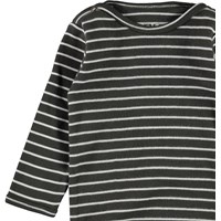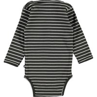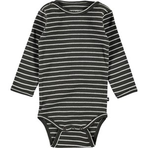 Foss er en langærmet baby body i mørkegrå med smalle hvide striber. Trykknapper ved hals og mellem ben, gør det let at få bodyen af og på.