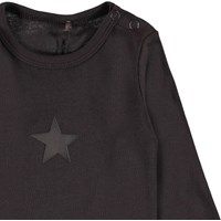 Foss er en langærmet baby body i mørkebrun med stjerne på fronten. Trykknapper ved hals og mellem ben, gør det let at få bodyen af og på.