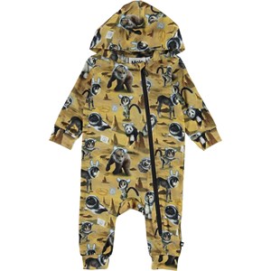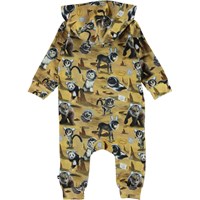 Fowo er en gul baby heldragt med print af forskellige dyr, som er kommet en tur på månen. Fowo har hætte og skrå lynlås lukning på fronten.