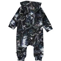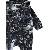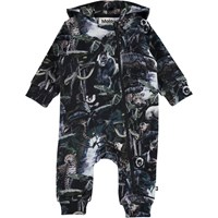 Fowo er en baby heldragt med print af junglens dyr i måneskinnet. Fowo har hætte og skrå lynlås lukning på fronten.
