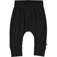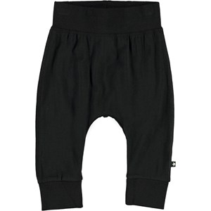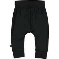 Sammy er et par rummelige, sorte babybukser i sweat look med bred, elastisk rib i talje og ved benafslutning.  Certificeret af Ecocert Greenlife, certifikationsnr. 197496.