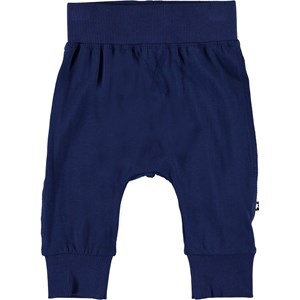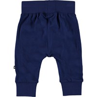Sammy er et par blå baby bukser. Bukserne har en bred elastisk rib ved talje og benafslutning, samt synlige stikninger foran, som giver bukserne et sweatpants look.