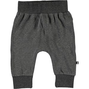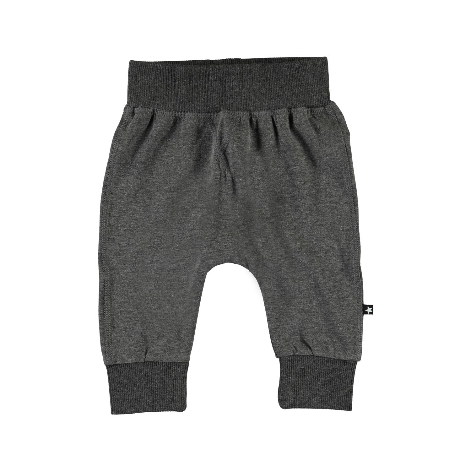 Sammy er et par mørkegrå baby bukser. Bukserne har en bred elastisk rib ved talje og benafslutning, samt synlige stikninger foran, som giver bukserne et sweatpants look.