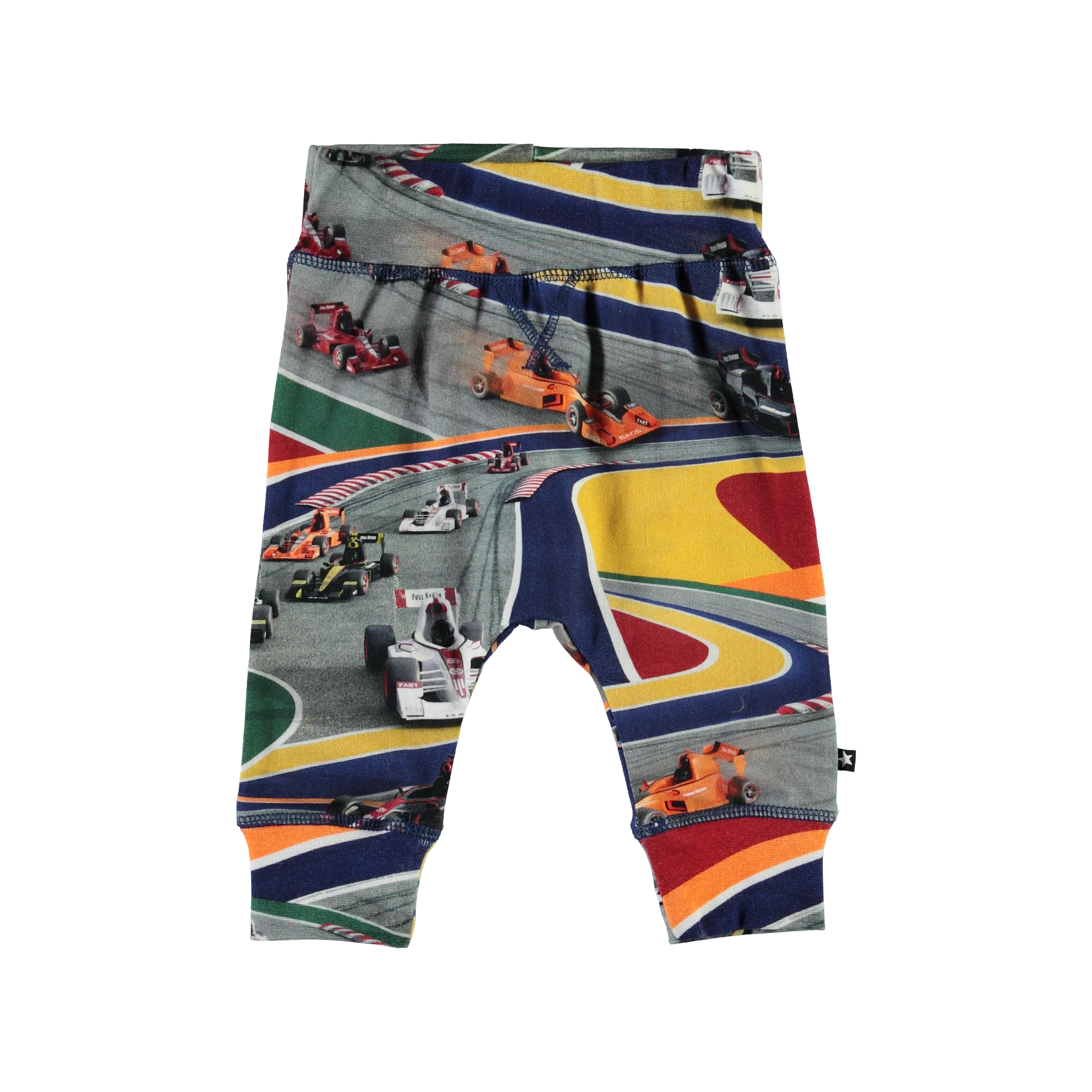 Sammy er et par baby bukser med print af farverige racerbiler. Bukserne har en bred elastisk rib ved talje og benafslutning, samt synlige stikninger foran, som giver bukserne et sweatpants look.