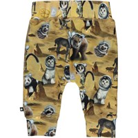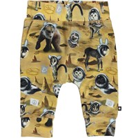 Sammy er et par gule babybukser med print af forskellige dyr, som er kommet en tur på månen. Bukserne har en bred elastisk rib ved talje og benafslutning, samt synlige stikninger foran, som giver bukserne et sweatpants look.