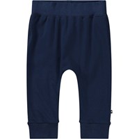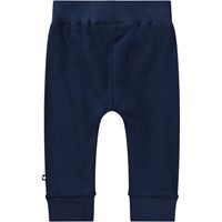 Marineblå bukser til de mindste lavet af blødt økologisk bomuldsjersey. Bukserne har en bred elastisk rib ved talje og benafslutning, hvilket gør dem behagelige at have på og giver masser af bevægelsesfrihed.