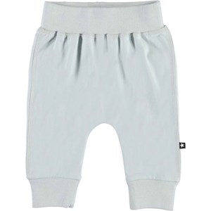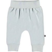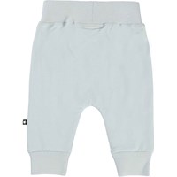 Sammy er et par bløde lyse blågrå babybukser. Bukserne har en bred elastisk rib ved talje og benafslutning, samt synlige stikninger foran, som giver bukserne et sweatpants look.