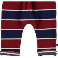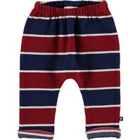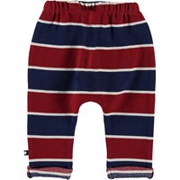 Sigurd er et par stribede baby bukser i rød og blå med smalle hvide striber. Bukserne har opsmøg i benene og en elastisk talje, som sikrer et komfortabelt fit.
