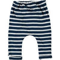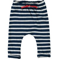 Sigurd er et par rummelige baby bukser med hvide og blå striber. Bukserne har et rødt bindebånd i livet og ombuk for enden af benene.