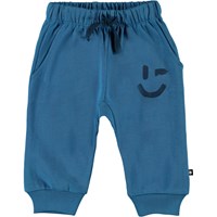 Simme er et par bløde og behagelige babybukser i blå med print af smiley. Bukserne har bindebånd i livet, samt lommer i siderne.