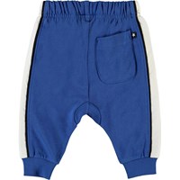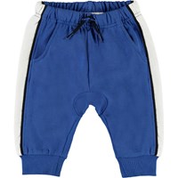 Simme er et par bløde og behagelige babybukser i blå med hvid stribe og sort piping ned langs siderne. Bukserne bindebånd i livet.  Certificeret af Ecocert Greenlife, certifikationsnr. 197496.