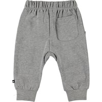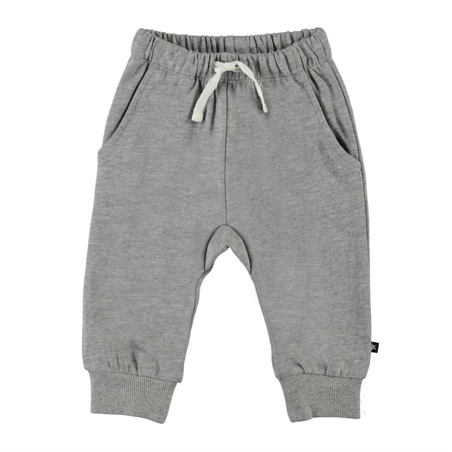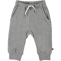 Simme er et par bløde og behagelige babybukser i grå meleret. Bukserne har hvidt bindebånd i livet, samt lommer i siderne.