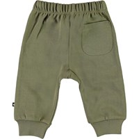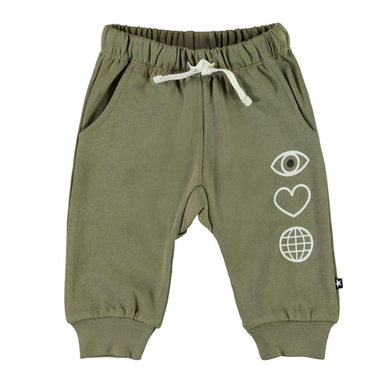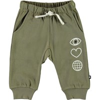 Simme er et par bløde og behagelige babybukser i khaki grøn med forskellige print på det ene ben. Bukserne har hvidt bindebånd i livet. Certificeret af Ecocert Greenlife, certifikationsnr. 197496.